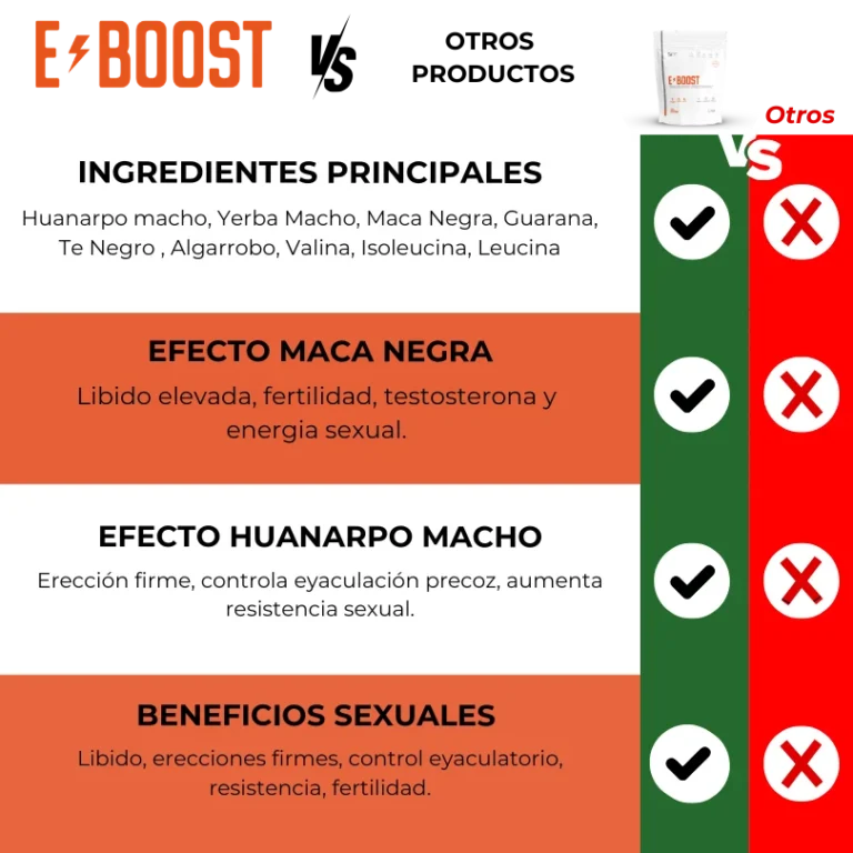 Porque E-BOOST no es un químico de efecto momentáneo, sino una fórmula completa que recupera tu energía, deseo y rendimiento desde dentro. Mientras otros productos sólo estimulan temporalmente, E-BOOST fortalece tu cuerpo, mejora tu circulación y potencia tu confianza día tras día.